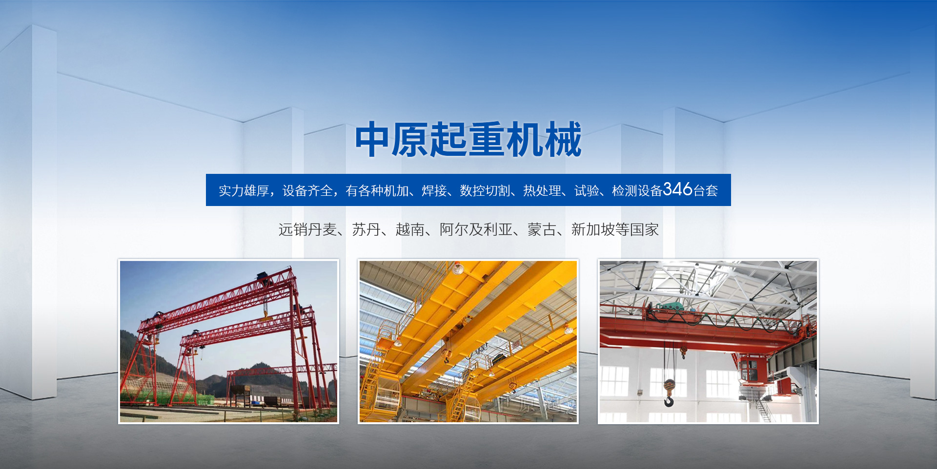新鄉市中原起重機械有限公司成立于2000年,地處中原,輻射全國28個省市自治區,設外埠經銷處、辦事處268個。產品行銷工礦、建材、化工、冶金、電力、交通、鐵路、油田、港口等各個行業。遠銷丹麥、蘇丹、越南、阿爾及利亞、蒙古、新加坡等國家?! 」緦嵙π酆?,設備齊全,有各種機加、焊接、數控切割、熱處理、試驗、檢測設備7臺;有機加工、熱處理、單、雙梁橋門機生產、檢測、安裝等9個車間,研究中心、運輸公司、安裝維修服務公司等機構,?  主要產品有:LD型1~20噸電動單梁起重機系列產品;5~600噸通用橋式、門式、冶金、上旋轉下旋轉電磁吊、絕緣、抓斗、防爆起重機系列產品;LH3~100噸葫蘆雙梁系列產品;MH5~32噸葫蘆門式系列產品;0.5~40噸CD1、MD1鋼絲繩電葫蘆系列產品;HS1型0.5~20噸手動葫蘆系列產品;0.5~10噸環鏈電動葫蘆系列;0.5~40噸彎道電動葫蘆系列產品;裝卸橋、造船門機、架橋機、鑄造吊和水電大噸位起重機系列產品?! 」窘⒘藦娪辛Φ馁|量保證體系和生產過程的質量控制系統,嚴格執行國家設計、生產標準,有嚴格的生產工藝過程和標準,嚴格的檢驗、檢測標準和手段。
